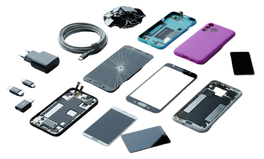 Broken LCD screens, touch, Phone covers, chargers, cables etc